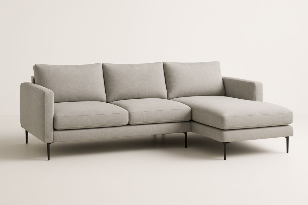 Divano angolare in tessuto grigio con struttura in legno