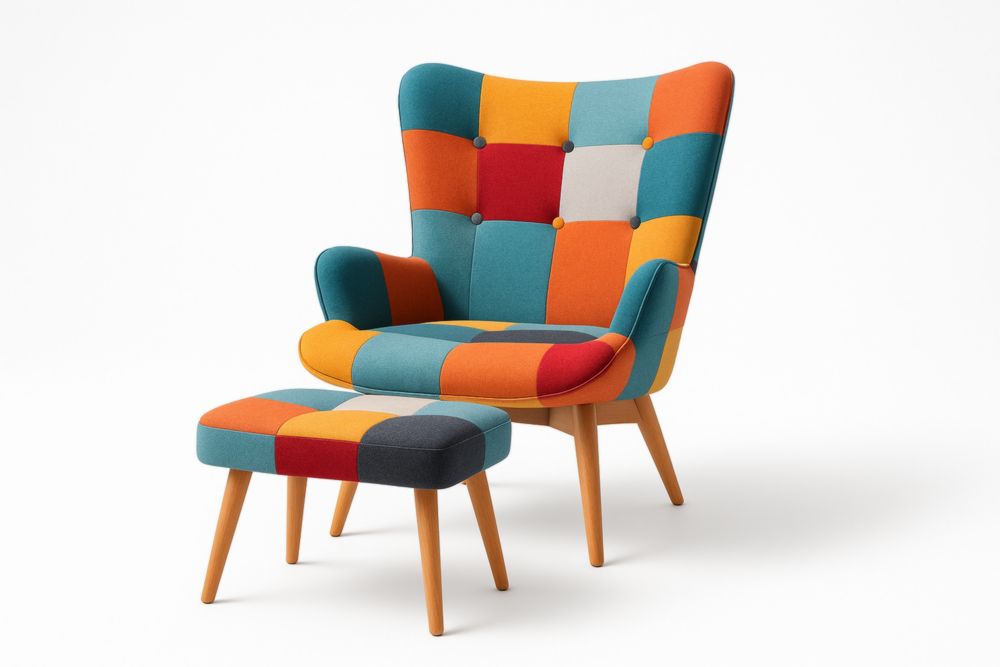 Poltrona Patchwork Multicolore con Poggiapiedi in Tessuto e Legno