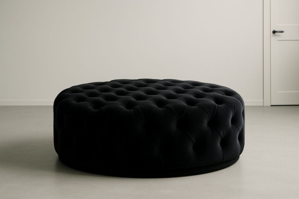 Pouf rotondo in velluto nero con dettagli imbottiti