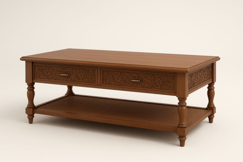 Tavolino da caffè in legno intagliato marrone con cassetti